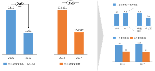 在如此严厉的调控之下,2017年北京市成交新房的套均面积仍在不断扩大,新房持续改善化的趋势依旧不减。全年商品住宅套均成交面积159平米,较2016年154平米仍在继续上升。而二手房的套均成交面积仍然只有91平米。结合2017年二手房与一手房成交套数比例高达6.6的数据来看,这也充分证明了北京已经完全进入了 “改善靠新房,首置靠二手”的成熟市场。